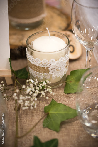 Chemin de table de mariage rustique avec toile de jute. Le theme champetre est tendance quelle que soit la fete a laquelle il est associe. Pour creer une decoration mariage champetre choisissez des matieres naturelles pour orner la table comme un chemin de table en lin ou encore un chemin de table en toile de jute.